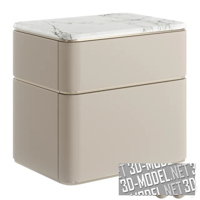 Современная прикроватная тумба Lambert от Fendi Casa (2021). Светло-бежевый корпус и фасады глухих фасадов двух выдвижных ящиков разделены горизонтальным золотистым молдингом в углублении. Такая же вставка отделяет корпус и мраморную столешницу с аккуратной фацетой. Невысокий цоколь тумбы тоже золотистый, металлический. Вертикальные ребра и углы столешницы скруглены. Полированный мрамор на столешнице представлен в двух вариантах: белый с темными прожилками (Calacatta Warm Gold) и черно-коричневый со светлыми прожилками (Portoro Palladium). Габарит тумбы: 65х48х60см.