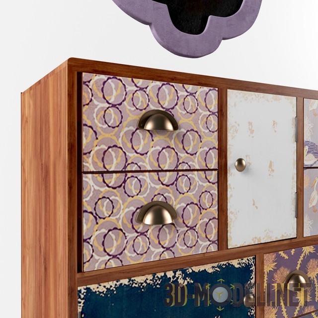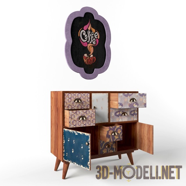3d-модель консольной тумбы Puertas Malibu. Изюминка мебели состоит в том, что она сделана с разными ящиками, плюс в комплекте идет меловая доска. Ящики сделаны из дерева и оформлены в разных цветах.