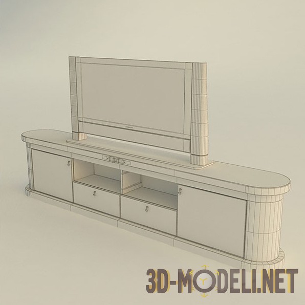 3d-модель тумбы для телевизора и другой аппаратуры от фабрики Formitalia, Италия. Мебель имеет гармоничную овальную форму, оснащена открытыми и закрытыми полками. Относится к напольному типу установки, изготовлена из массива дерева, имеет в декоре фирменный, кожаный принт компании.