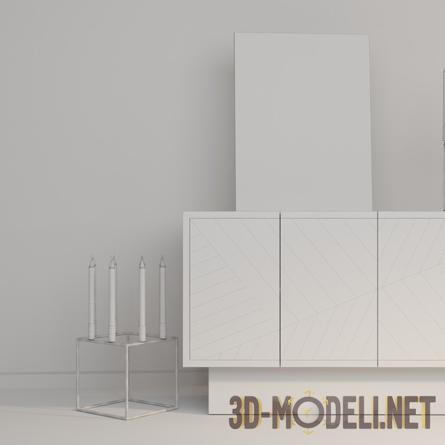 3D-модель консоли Changes Media от Kravitz Design, разработана специально для CB2, в сотрудничестве с Lenny Kravitz. Асимметрия и геометрия дизайна, вдохновленного поп-артом 70-х, чередование матовой и полированной полосы по диагонали, создает иллюзию сдвига рисунка. Изменения происходят в зависимости от того, как падает свет, и от местоположения консоли в комнате. Материал изготовления – нержавеющая сталь. Также консоль имеет две съемные внутренние полки. Размеры: 1524 х 508 х 812 мм. В сцене также присутствует декор: подсвечник из черного металла KUBUS 8 от Lassen, и картина «WANT» от Inga Makarova, размером 60 x 80 см.