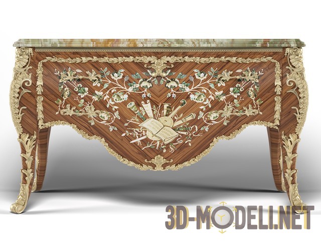 3d-модель деревянного серванта с выдвижными ящиками, сделанного в классическом стиле. Производителем является итальянская фабрика Modenese Gastone, сервант из коллекции Bella Vita, его артикул 13604. Необыкновенно красивый фигурный фасад светло-коричневого цвета с цветной деревянной инкрустацией, мраморная столешница и гнутые ножки, густо украшенные золотой резьбой, а также золотая выпуклая инкрустация по периметру фасада дополняют впечатление умопомрачительной роскоши, так свойственное моделям этого производителя. Размеры серванта в см: L. 165 P. 55 H. 96. Текстуры в архиве.
