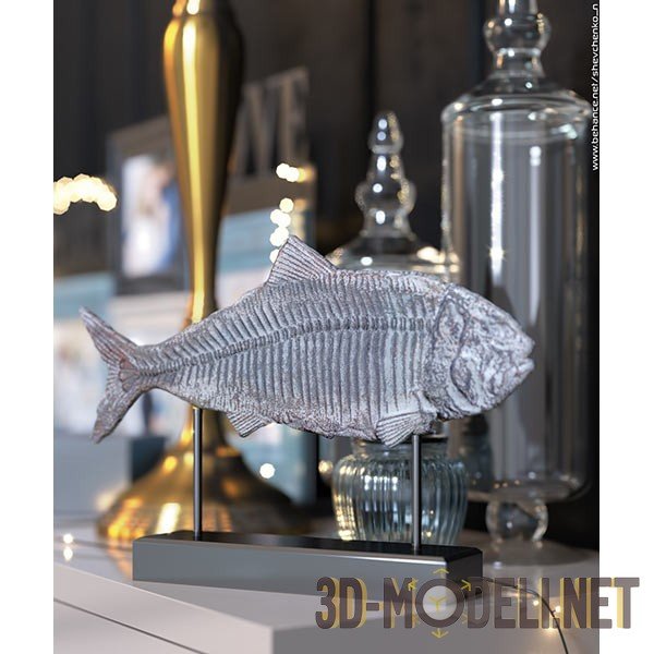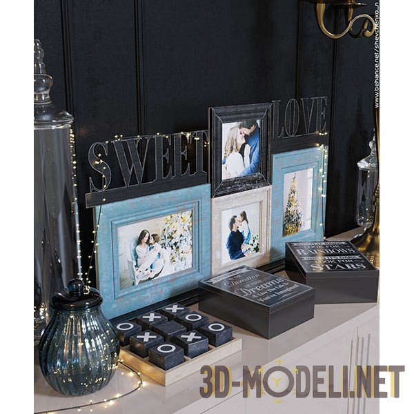 3d модель современной прямоугольной тумбочки белого цвета на квадратных металлических ножках, с четырьмя раздвижными дверками. На тумбочке расположено множество декоративных предметов, которые можно использовать в дизайне интерьера практически любого жилого помещения. Это высокий золотой канделябр с пятью свечами, голубые рамки для фотографий, скульптурные фигурки, а также вазы разной величины и формы.