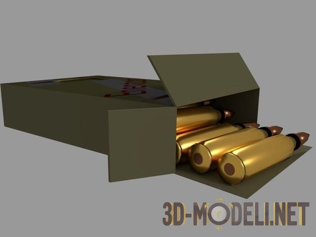 Коробка цвета хаки с винтовочными патронами. В латунных гильзах закреплены заострённые пули. На плоскости коробки надпись «Enenton».