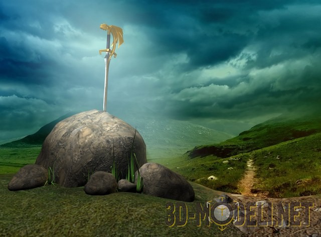 3D-модель старинного меча, закованного в камне и освещенного «божественным светом». На создание вооружения у кузнеца-удальца Алексея ушло около четырех дней. Объект содержит порядка 105 тыс. треугольников, а как следствие — может использоваться при изготовлении качественных обоин для рабочего стола и несложных анимационных роликов.