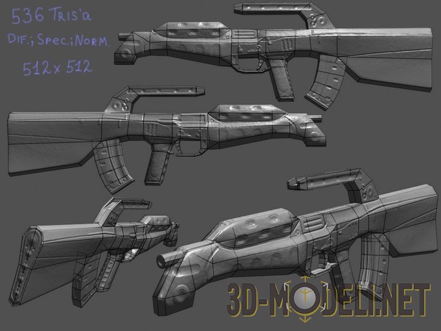 Простенькая low-poly 3D-модель вымышленной штурмовой винтовки AR-XM. В общих чертах напоминает оружие пришельцев из лощеного блокбастера Crysis. Объект состоит из 536 треугольников. Качественные текстурные развертки прилагаются. Полагаем, что такое вооружение найдет достойное применение в любом современном экшене уровня F.E.A.R..