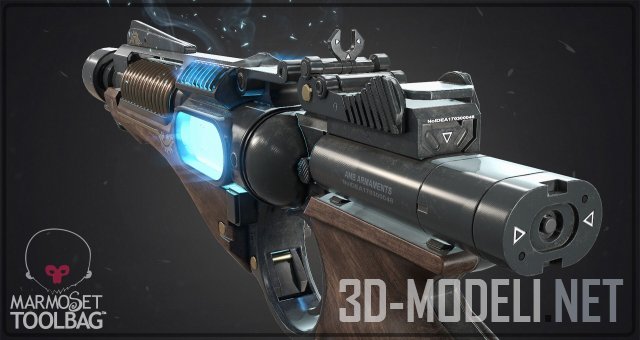Предмет игрового компьютерного мира от фрилансера из Великобритании Alexander Varegg. Фантасмагорический симбиоз старинных пистолей и неведанных технологий с капсулой, источающей яркое голубое свечение. Сочетание обработанного дерева и вороненых в графитовый цвет металлических деталей, лаконичная золотистая инкрустация на ложе ствола создает оригинальный продукт для игрового мира.