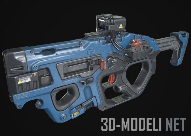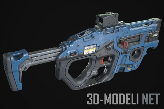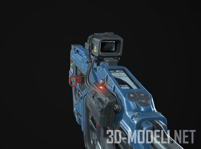Фантастическое оружие под названием Mega Volt. Ручной автоматический пистолет, выполнен в стиле тяжелых электроинструментов, со следами эксплуатации. Сине-черное сочетание элементов, выдвижной приклад, планка Пиккатини, курок и затвор – красные.