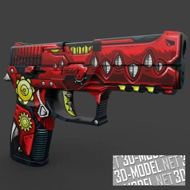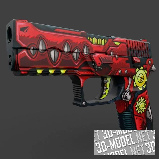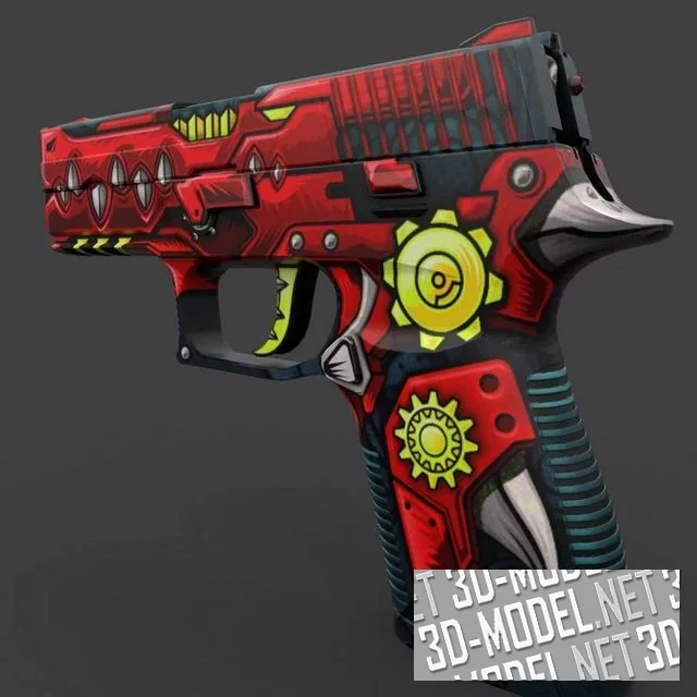 Низкополигональная модель самозарядного пистолета SIG Sauer P250 от фирмы Sauer&Sohn. Пистолет декорирован скином с агрессивным красновато-желтым изображением с клыками, когтями и шестеренками.
