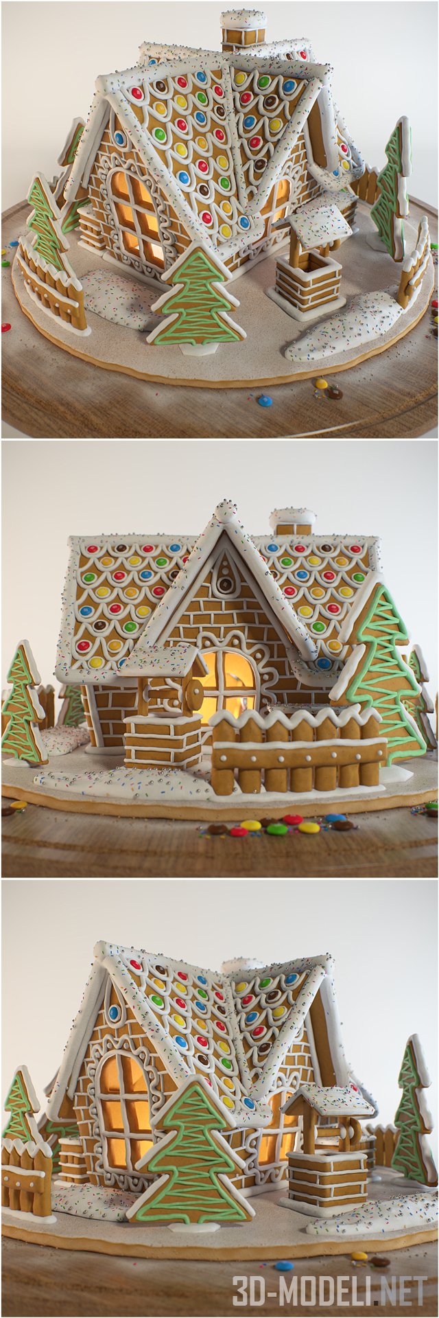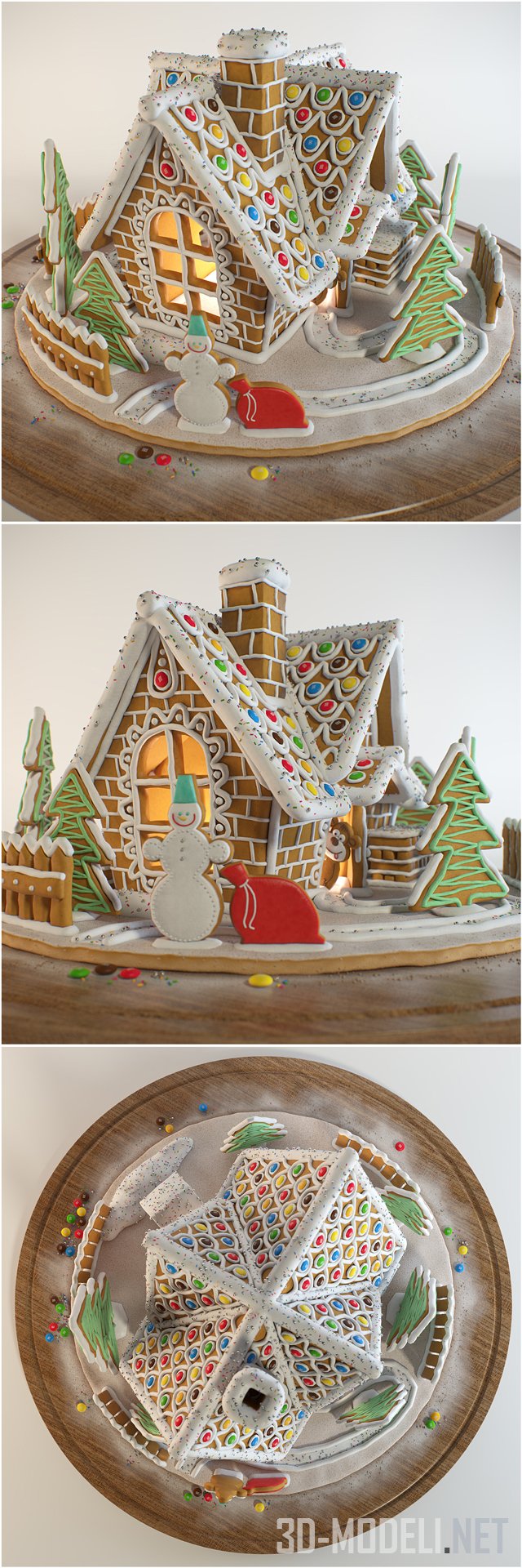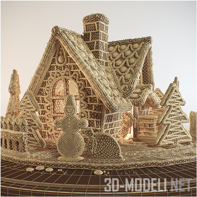 Чудесный домик из песочного теста с нарисованными белой глазурью кирпичиками, крышей, усыпанной разноцветными конфетками M&Ms и съедобной мишурой, елкой и снеговиком с огромным красным мешком. Качественная 3d-модель в архиве находятся файлы 3ds Max 2011 и 2014 и obj с материалами MTL и MAT.