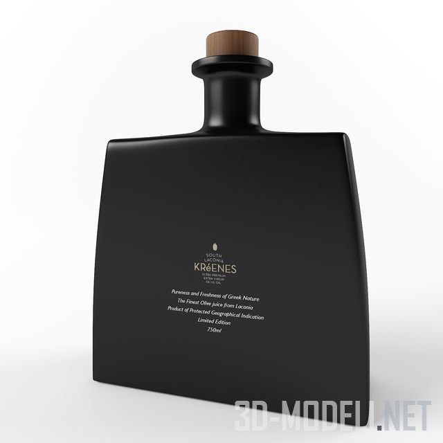 Красивая черная бутылка, с надписями на фронтальной стороне закрытая пробкой. Это оливковое масло Kreenes Ultra Premium производится из маслин, выращенных в лучших органических рощах в мире, расположенных в холмистых районах вокруг провинции Южная Лакония. Это место с большим количеством солнечного света, богатой почвой рядом с морем и его животворящими бризами. Это идеальный микроклимат для оливковых деревьев. Стойкое, ароматическое и действительно редкое оливковое масло, 3D модель которого представлена здесь, станет реалистичной деталью интерьера современной кухни.