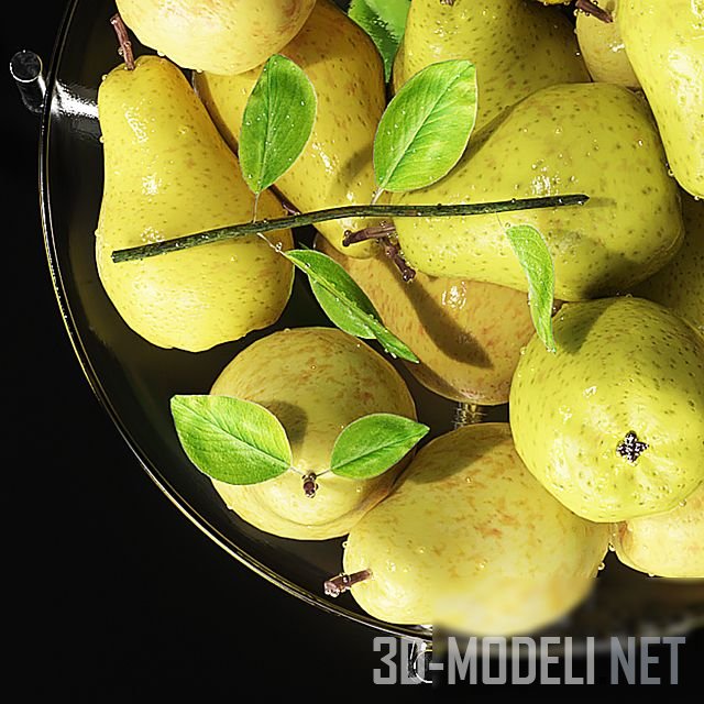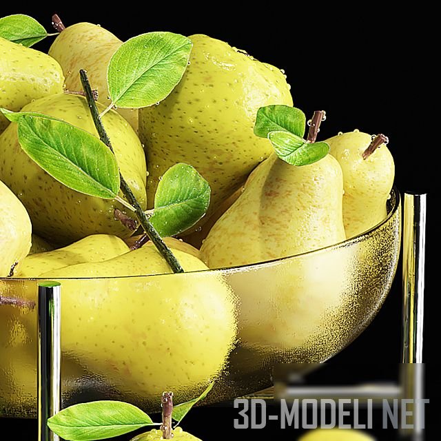 Сочная фруктовая композиция – желтые спелые груши. Уложены в стеклянную вазу. Золотистый цвет ножек вазы отлично сочетается с грушами.