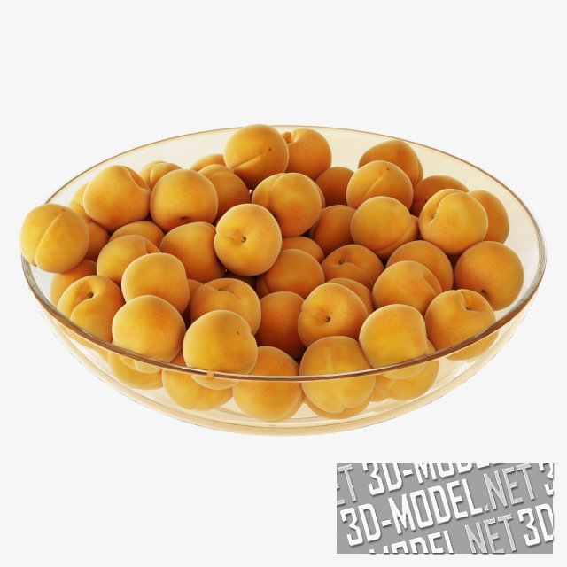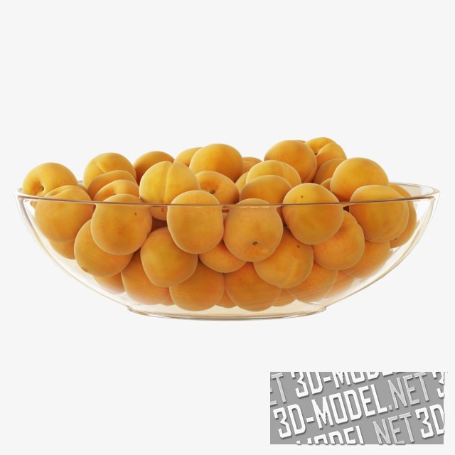 Стеклянная ваза, наполненная аппетитными желто-оранжевыми абрикосами. Такую реалистичную трехмерную модель можно с успехом применить при проектировании интерьера кухни или столовой. Эта небольшая деталь декора придаст приятную достоверность помещению.