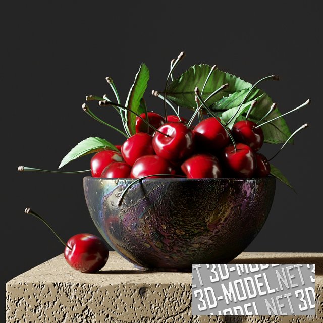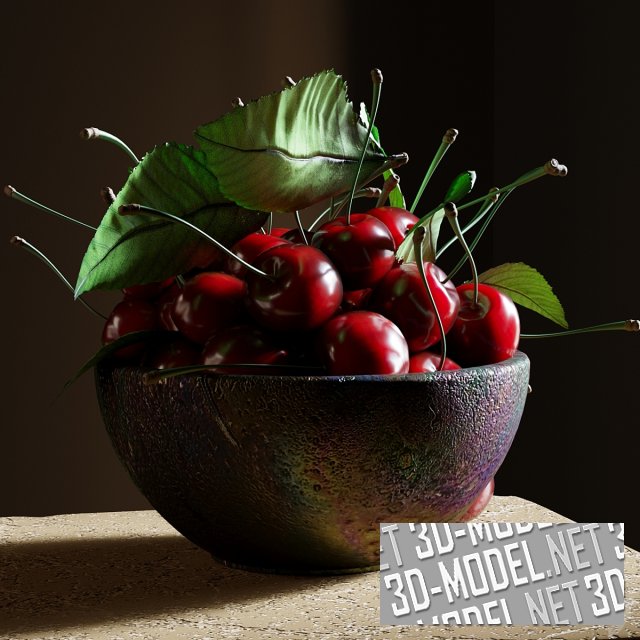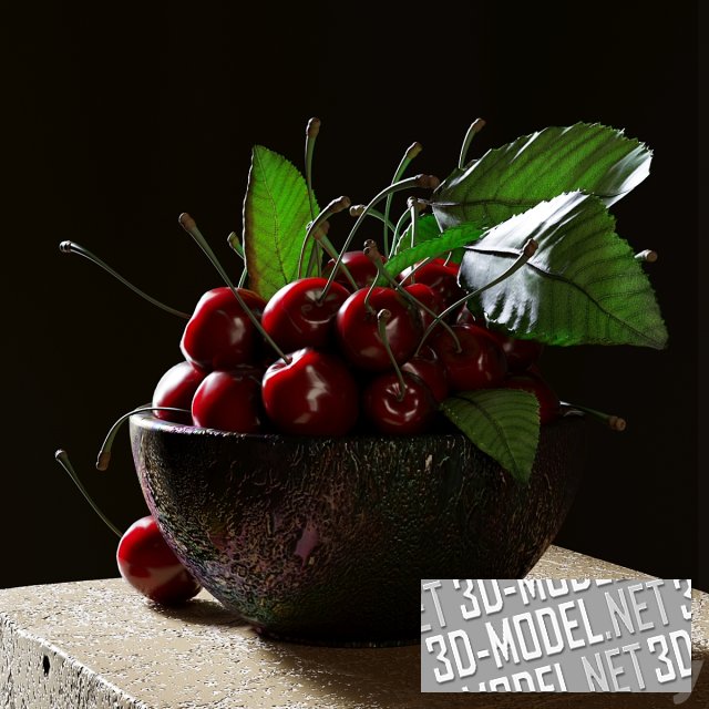 Рустикальная миска с ягодами спелой черешни. Черешня сорвана вместе с зелеными листьями, что придает композиции декоративность и натурализм. Качественная трехмерная модель для красивых визуализаций.