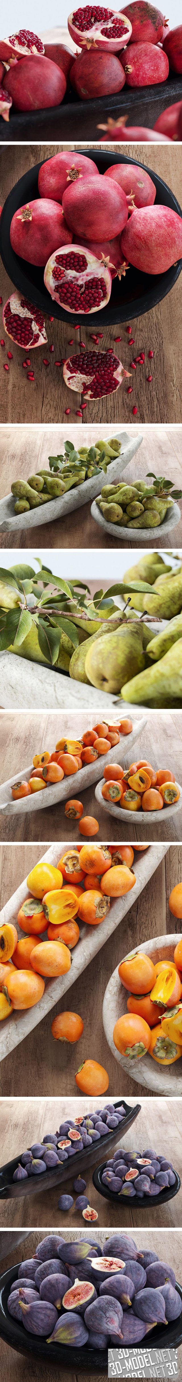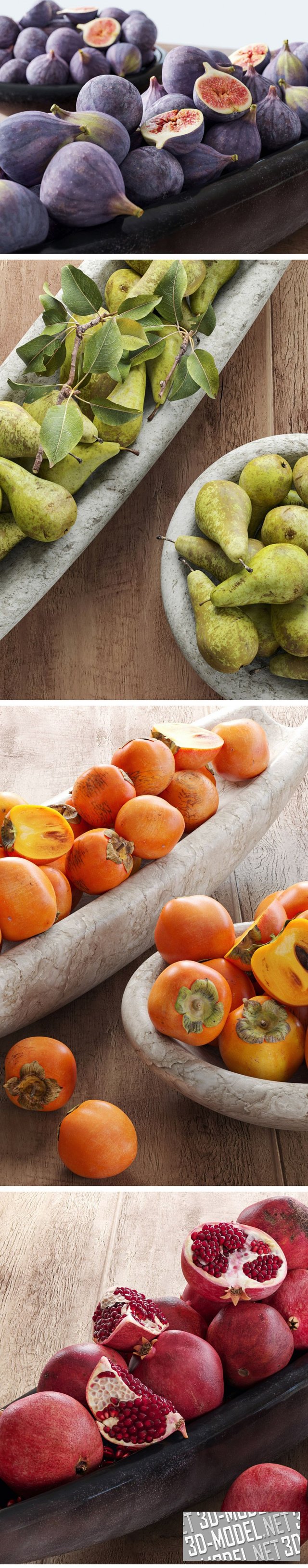 Рустикальные, нарочито грубые емкости в виде лодочки и невысокой плоской миски, словно выдолбленные из дерева темно-коричневого и белого цвета. В них лежат три вида восточных фруктов. В коричневых: ярко-красные гранаты, целые и разломанные пополам и инжир. В белых лодочках и мисках лежат зеленые груши и оранжевая хурма.