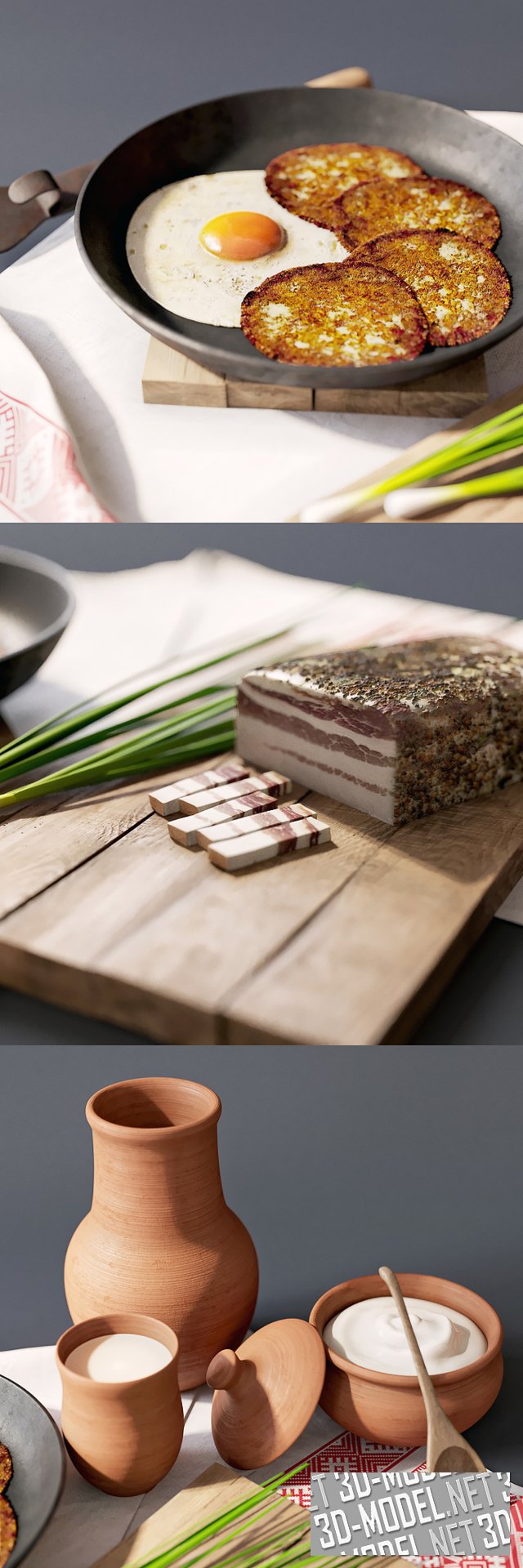 Композиция на тему «еда народов мира» - белорусский обед. На вышитых красным орнаментом белых рушниках разместились разделочные деревянные доски и глиняная посуда. На одной из досок сковорода с яичницей-глазуньей и драники. На второй кусок сала, присыпанного черным перцем и перья зеленого лука. В глиняной посуде молоко и сметана. К миске прислонилась деревянная ложка. Возле сковороды лежит рустикальная ручка-прихватка.