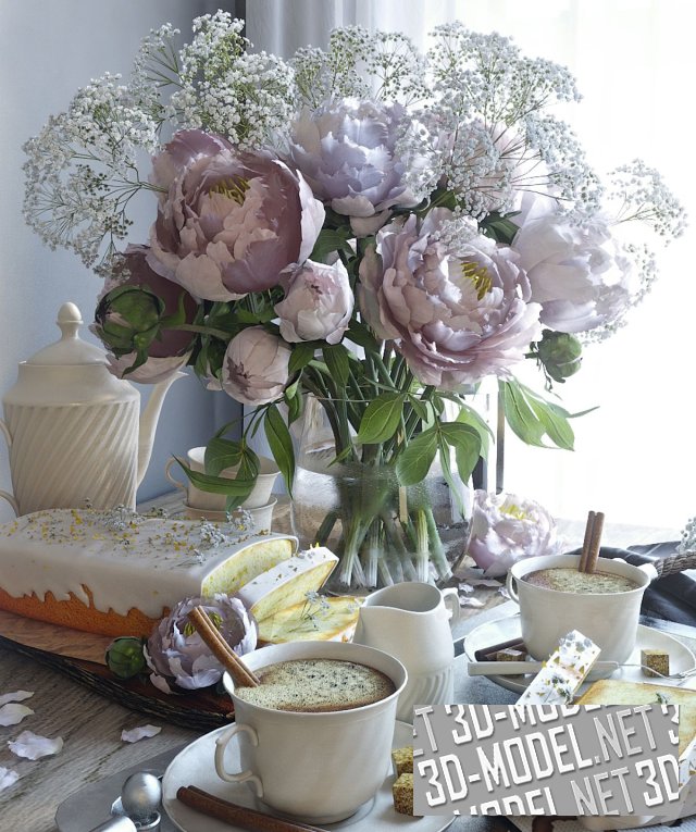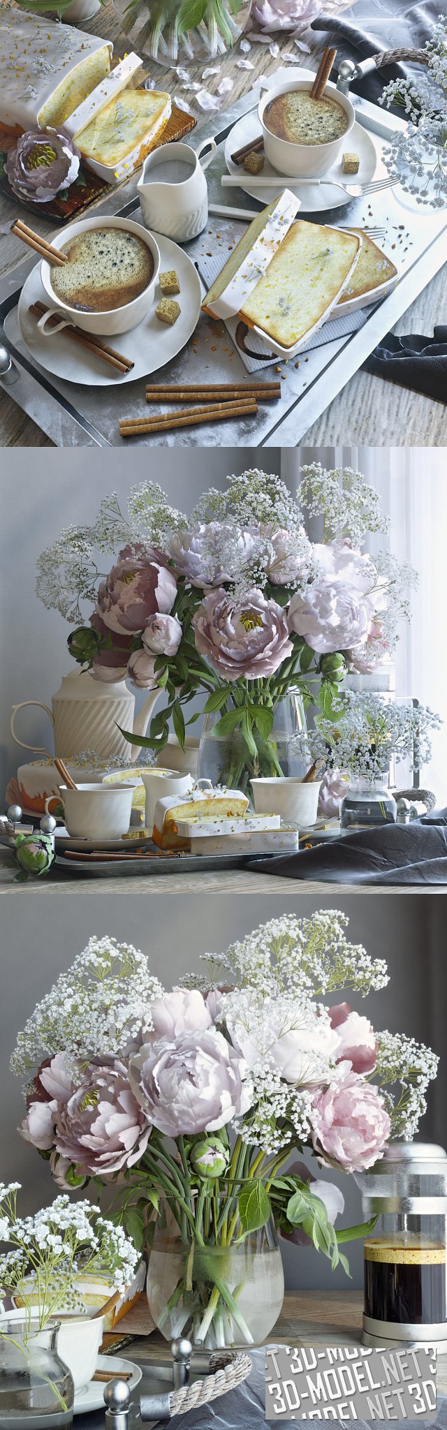 Современный натюрморт с букетом из розовых пионов с белой гипсофилой и завтраком. Цветы размещены в большой прозрачной стеклянной вазе. Белая посуда (кофейник, чашки с кофе, блюдца) дополняют стеклянный френч-пресс и маленькая прозрачная стеклянная вазочка с букетиком белой гипсофилы. На переднем плане разместилась серая тканевая, живописно-свернутая салфетка и прямоугольный серебристый металлический поднос с ручками из каната. На подносе - чашки с кофе, палочками корицы и кубиками сахара на блюдцах, белый кувшинчик для сливок и кусочки нарезанного кекса с белой глазурью и желтой присыпкой. Оставшаяся часть кекса лежит на доске.