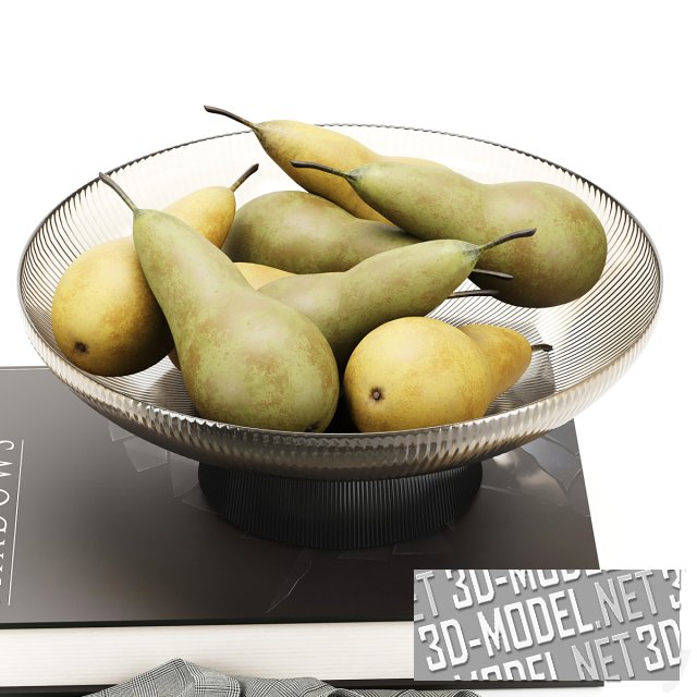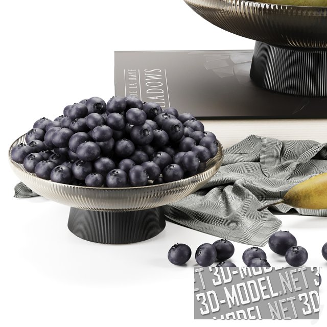 На большой книге в коричневом переплете стоит ваза из дымчатого коричневого рифленого стекла. Ваза наполнена аппетитными грушами. В такой же вазе насыпана горкой голубика. Несколько ягод возле вазы. На небрежно брошенной большой салфетке в мелкую серую клетку лежит одна груша.