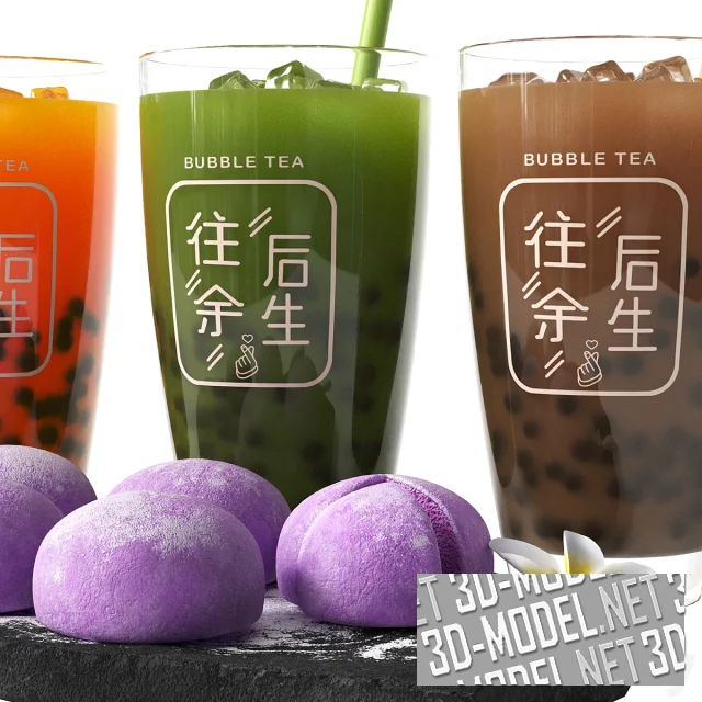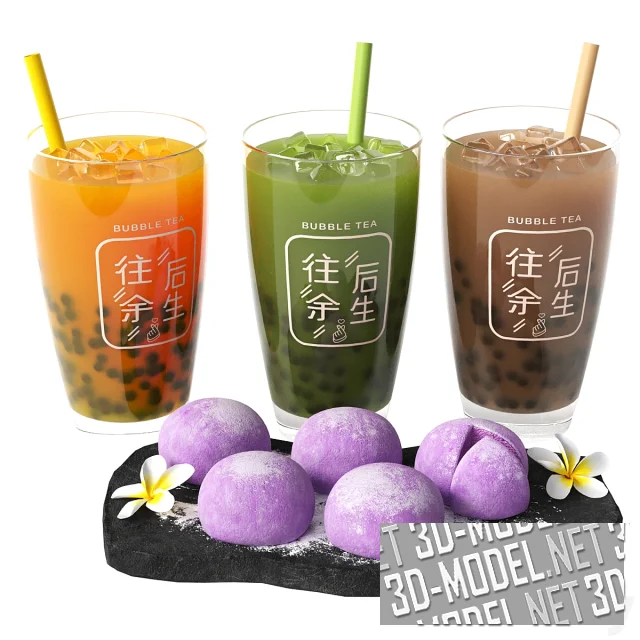 Моти и бабл-ти. Три вида напитка бабл-ти (оранжевый, зеленый, коричневый) с шариками, льдом и коктейльными трубочками в цвет напитка разлиты в стаканы из прозрачного стекла с белыми надписями на японском и английском языках. Сиреневые колобки японского десерта моти размещены на пластине из черного камня. Один из моти разрезан. Моти присыпаны сахарной пудрой и украшены парой цветков плюмерии.