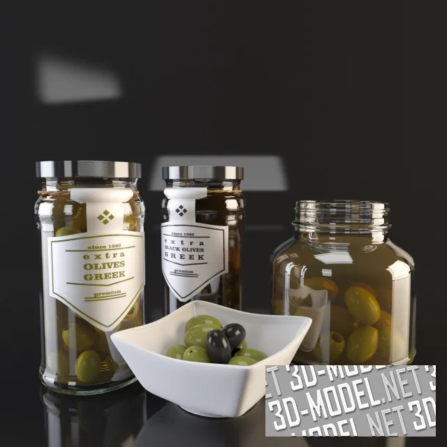 Зеленые и черные греческие оливки, в небольших стеклянных банках с жестяными крышками и без. Небольшое количество плодов лежит в белой керамической квадратной миске. На боковых поверхностях закупоренных банок нанесены фигурные белые этикетки с надписями оливкового и черного цветов с соответствующими плодами внутри. Третья банка (открытая), без этикетки и крышки, ниже и большего диаметра, с зелеными оливками.