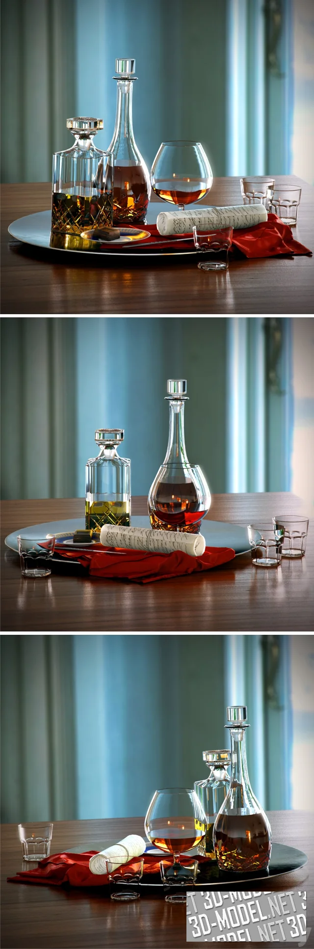 На большом круглом блюде разместились графин с виски и коньяком. Дополняют сет бокалы, красная салфетка и маленькая плитка черного шоколада.