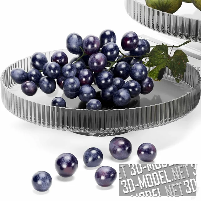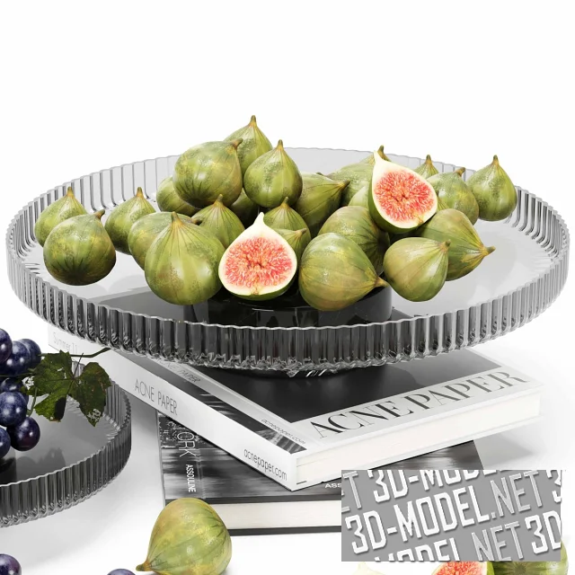 Небольшой настольный набор интерьерного декора. Сет содержит два круглых блюда с зеленым инжиром и черной смородиной, пару современных книг в черно-белых обложках. Несколько плодов инжира разрезаны пополам.