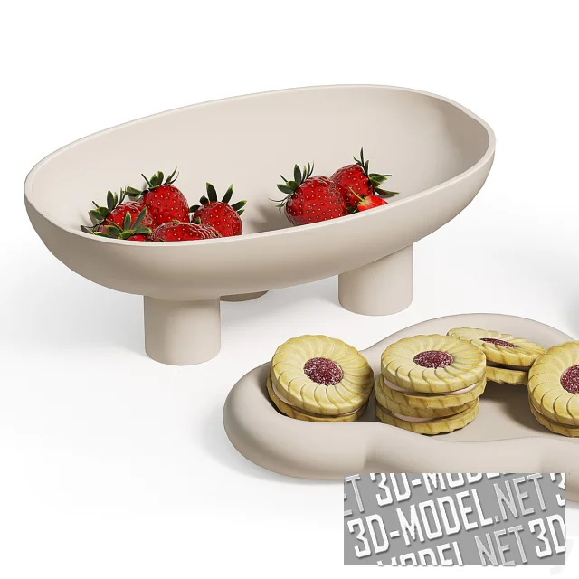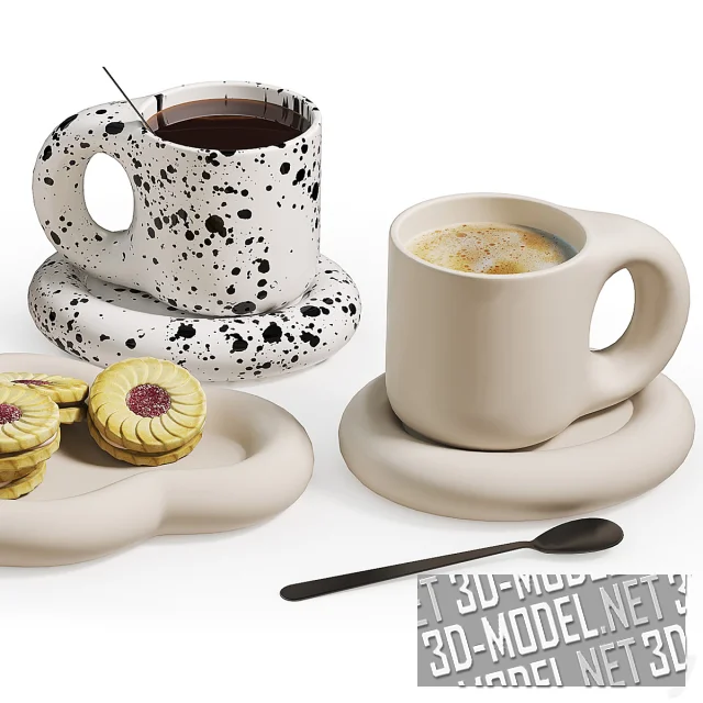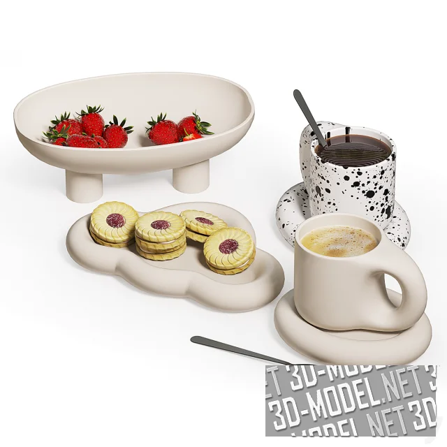 Забавный набор Chubby для чаепития. В комплекте две чайные чашки оригинального дизайна на блюдцах (утолщенные ручки чашек и овальные с утолщенными скругленными краями блюдца в светло-кремовой и белой отделке с черными каплями набрызга), черные чайные ложки, небольшой светло-кремовый поднос в форме облака с круглыми печеньями в виде цветов, овальная ваза для фруктов на двух цилиндрических опорах. В вазе для фруктов - ягоды клубники.