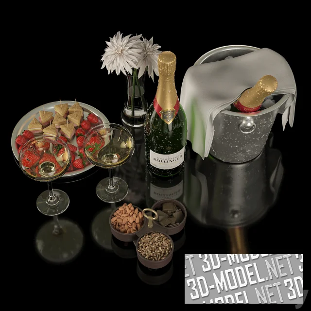 Эстетичный набор для романтичной сцены в интерьере с шампанским и закусками. В сете шампанское Bollinger (одна бутылка на столе, другая в серебристом ведре со льдом, накрытая белым полотенцем). Два стеклянных бокала наполнены напитком. Круглый стальной поднос с ягодами клубники и треугольными канапе, трехсекционная подставка с орехами и кусочками черного шоколада, стеклянная прозрачная вазочка с белыми георгинами органично дополняют композицию.