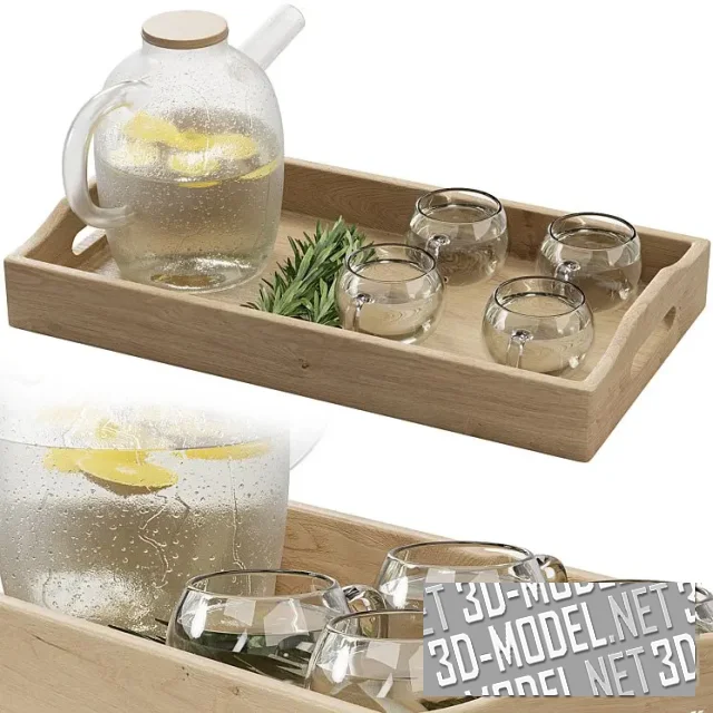 Деревянный прямоугольный поднос с бортами и прорезями ручек, стеклянные чашки с прозрачным напиткам и стильный запотевший стеклянный чайник с круглой деревянной крышкой. В сосуде - прозрачный напиток с нарезанным лимоном. Густая веточка розмарина, лежащая посреди подноса, вносит яркий акцент в композицию.