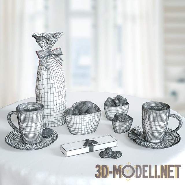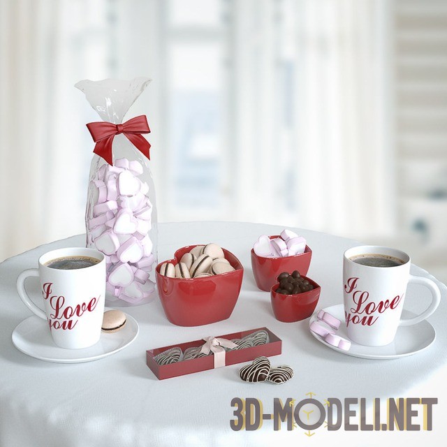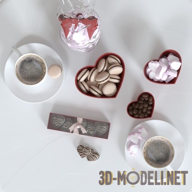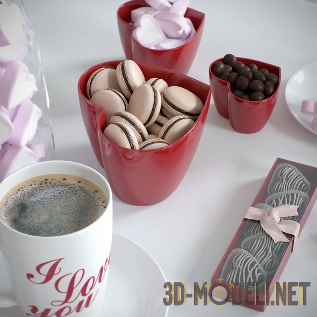 Эта 3D-модель обеспечит прекрасный романтический завтрак в День Святого Валентина, и не только. Крепкий ароматный кофе в изящных чашках, посуда и сладости в форме сердечек – в сцене присутствует много впечатляющих предметов для великолепных рендеров. В архиве содержатся текстуры и карты нормалей, файлы 3D Studio Max 2011 + obj.