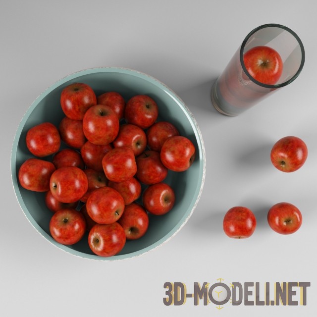 3D-модель красных яблок, лежащих в красивой вазе с густым белым рисунком. для живописности композиции три яблока находятся в высоком стеклянном стакане, и несколько лежат просто на столе. Можно использовать в визуализации интерьера любые из вариантов, или всю композицию целиком, для лучшего цветового декоративного наполнения пространства. Модель в формате 3ds max 2014 и fbx, материалы Vray, текстуры есть.