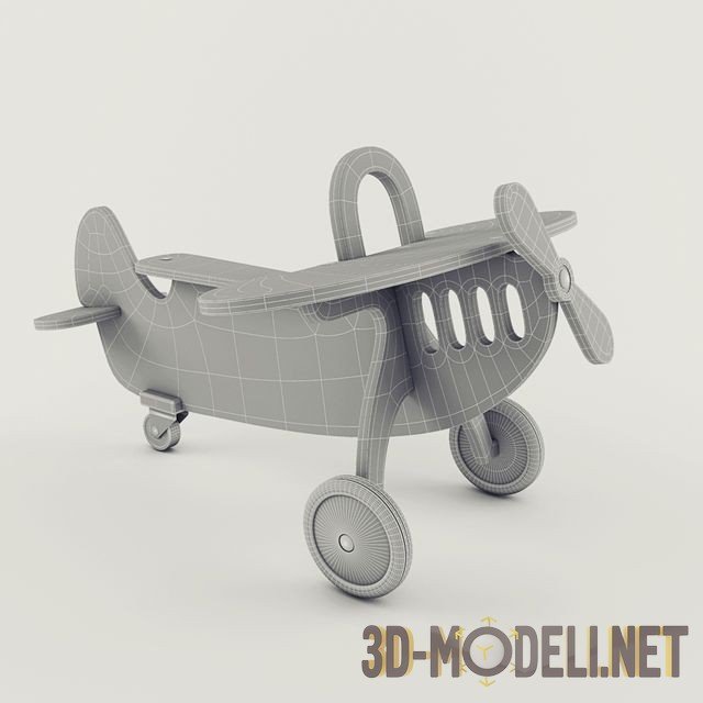 Фигурка в виде одномоторного самолёта, игрушка для детей. Аэроплан собран из нескольких деталей из толстой древесной плиты, на паре больших колёс и одном маленьком. Имеется возможность использовать игрушку как самокат. Для этого предусмотрено сиденье и скоба–ручка. Фюзеляж самолёта выкрашен белым, крылья и хвостовые стабилизаторы серые. Пропеллер, стойки шасси, ручка и сиденье отделаны прозрачным лаком, обнажая текстуру светлого дерева.