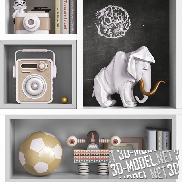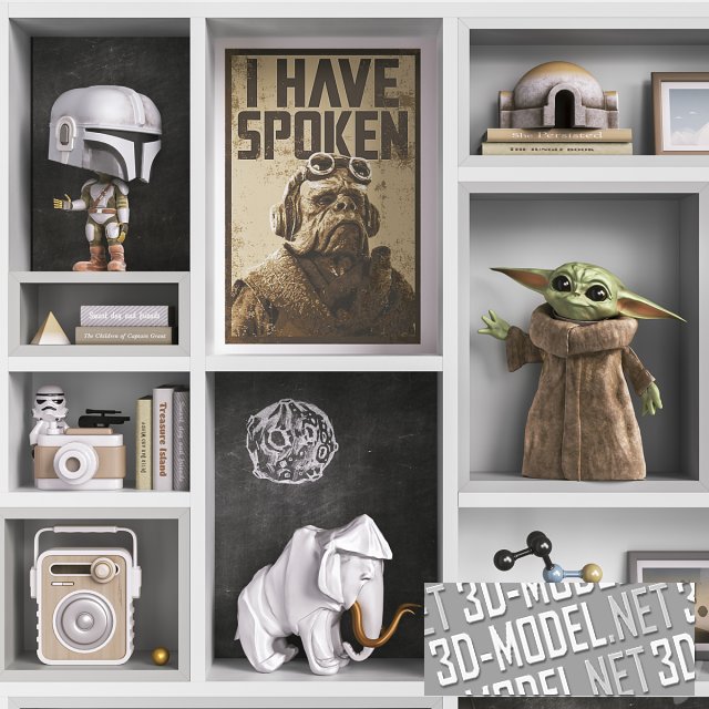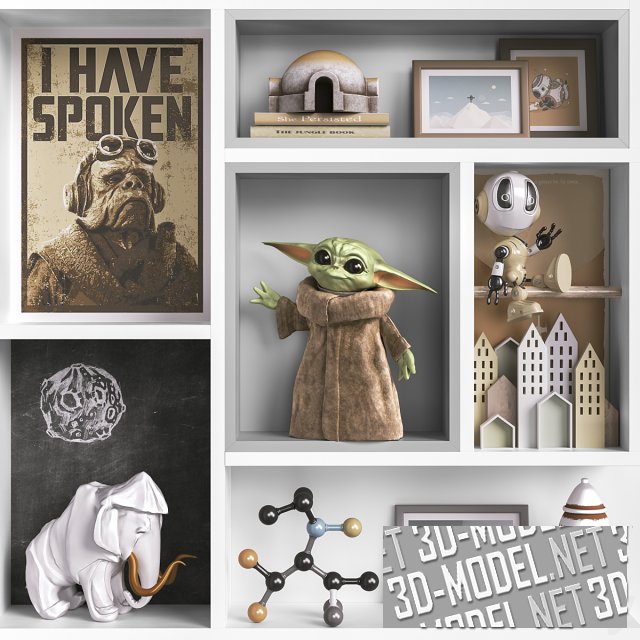 Качественный полноценный набор аксессуаров для наполнения детской комнаты. В комплекте игрушка из конструктора STACK & SCARE, рамки и декоративные элементы из ИКЕА, конструктор "Молекула", фигурки из конструктора Звездные войны, фигурка "Тигр", а также игрушка "Малыш Йода". Также присутствует декоративная фигурка "Мамонт", игрушка "Мандалорец", набор игрушек "Домики", робот—дроид R2-D2 из «Звездных войн», робот на батарейках, игрушка "Дом Люка" и множество других предметов. Это детская камера, ракета, машинка, меловые доски и пирамидки, картины, книги, мячи и пр.