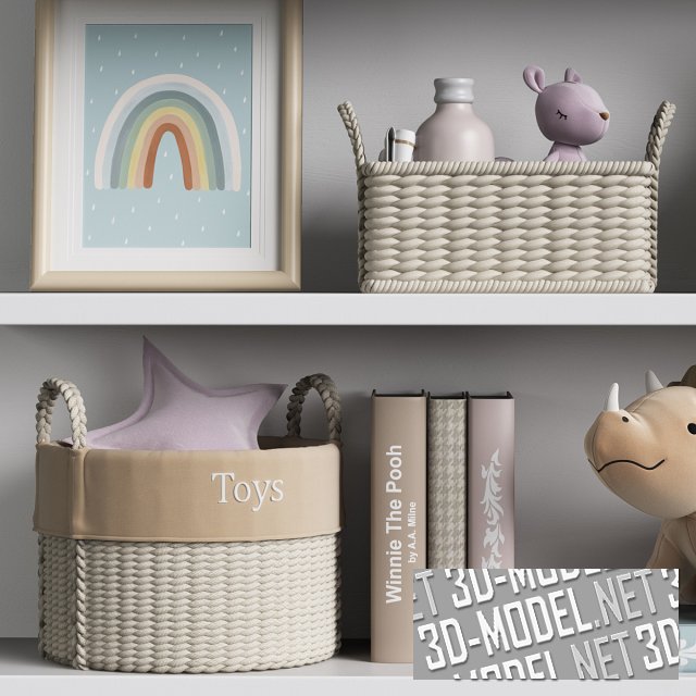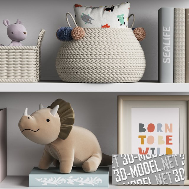 Украсить любую детскую комнату, придать ей жилой и игривый вид легко с помощью набора игрушек и аксессуаров. Этот сет содержит полки с книгами, постерами, корзинами и игрушками. Акцентом служат мягкие игрушки жираф и зебра.