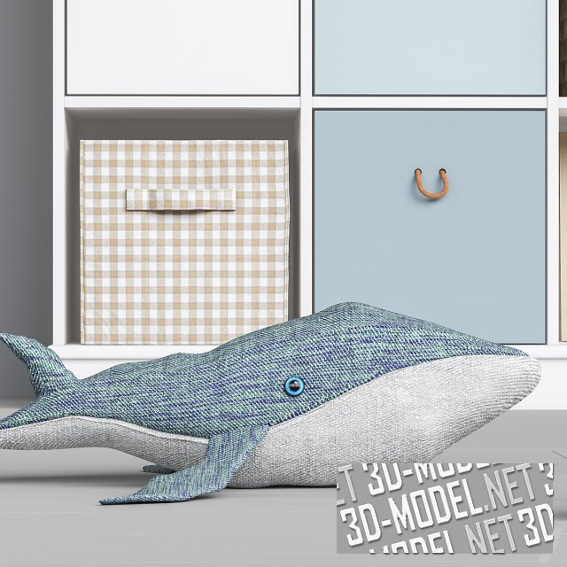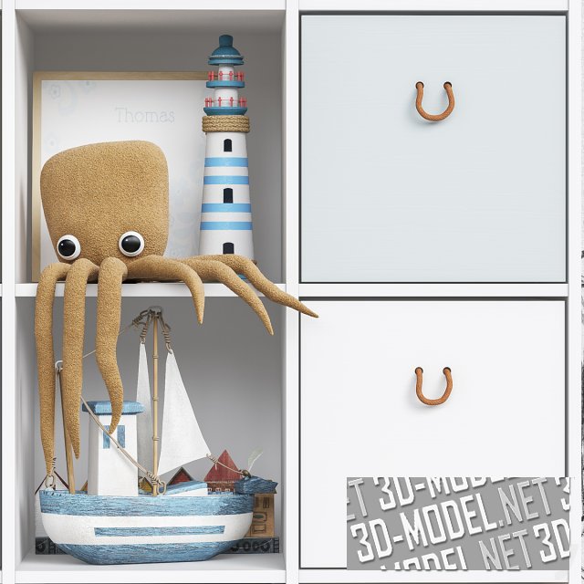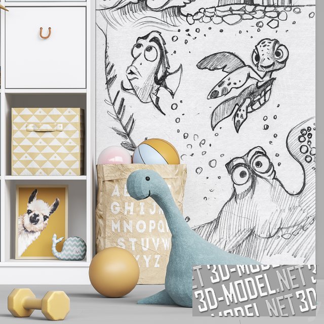 Мебель и игрушки в детскую комнату с рисунком на морскую тематику. В комплекте: шкаф для хранения, состоящий из пятнадцати открытых и закрытых квадратных ячеек (габарит: 104х180х36см); вертикальная настенная белая доска для рисования (180х90см) с рисованным черно-белым коллажем из персонажей мультфильма «В поисках Немо»; мягкие игрушки (Осьминог, кит, Нэсси); желтые гантели; мяч; корзина из крафтовой бумаги с мячиками.