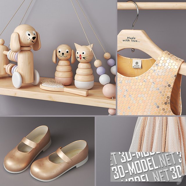 Современная деревянная полка с игрушками и с одеждой на вешалке. Платье расчитано на ребенка ростом 1 м. Внизу золотистые туфли. Размеры полки: 380 х 140 х 380 мм.