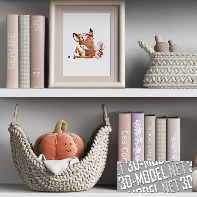 Современный набор декоративных аксессуаров для детской. На белых полках расположились игрушки в корзинках, картины в рамках и книги. Эта декоративная композиция гармонично впишется в любой интерьер детской комнаты.