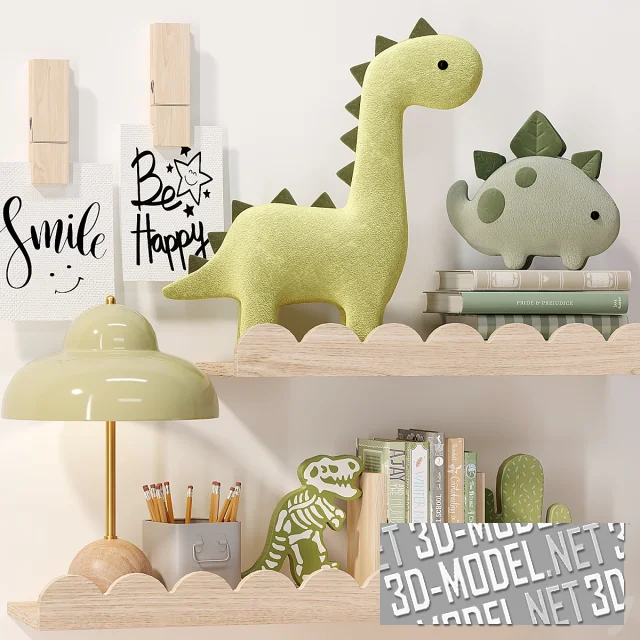 Набор игрушек от бренда Crate and Barrel и аксессуаров для детской комнаты. Деревянные полки с мягкими игрушками-динозаврами, книгами, карандашами и настольной лампой, кукольный домик и большой мольберт, одновременно выполняющий функцию доски для рисования образуют отличный функциональный комплект.