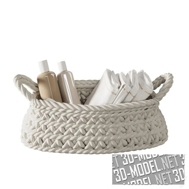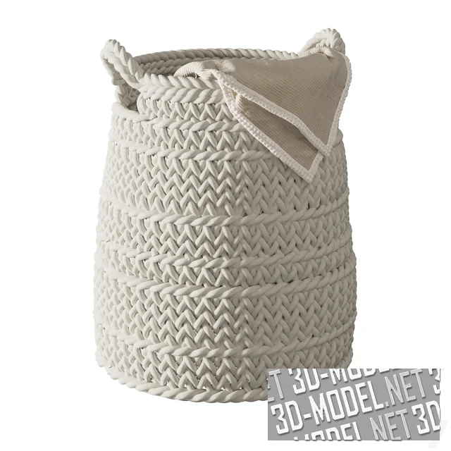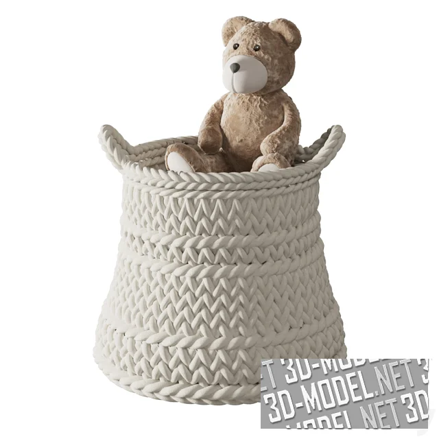 Три варианта корзин от Pottery Barn для хранения вещей, игрушек, белья, с эффектом крупной вязки, в цвете «слоновая кость». Корзины круглого сечения, разной высоты и формы. В верхнюю кромку вплетены две ручки. Из высокой корзинки свисает кусок бежевой ткани. В средней корзине сидит плюшевый игрушечный медведь. В низкой корзине размещены банные принадлежности (белые полотенца с золотистыми полосками и бутылочки карамельных оттенков).