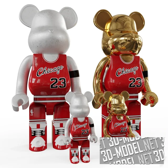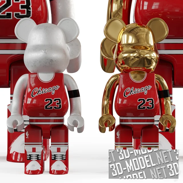 Современная культовая коллекционная фигурка медведя Bearbrick в образе баскетболиста в красно-белой спортивной форме команды Chicago Bulls с номером 23. Фигурки представлены в двух размерах (1000%-70см и 400%-28см) и двух цветах базы (полированный золотистый и жемчужно-серый).