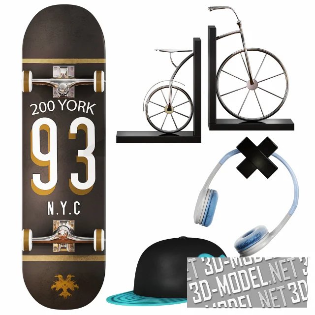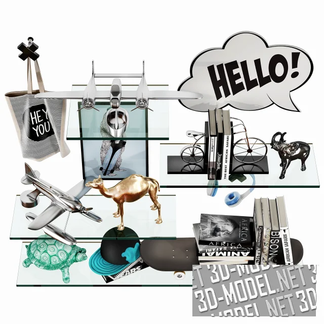 Расположившиеся на стеклянных полках скульптурные статуэтки, скейт, игрушечные самолеты, картина, книги образуют реалистичное наполнение для интерьера детской комнаты. На специальных крючках висят сумка «Hey you» и наушники.