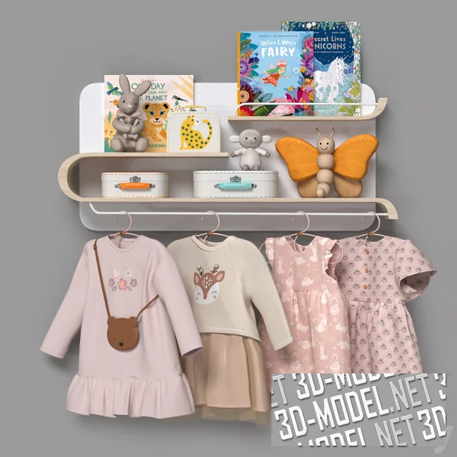 Фигурная деревянная полка L от Rafa Kids, с игрушками и книгами. К нижней части полки прикреплена тонкая белая металлическая штанга с вешалками (OYOY). На вешалках - сумочка-мишка Donsje и детские платья в розовых и бежевых тонах (от H&M и Verbaudet). На полке размещены три детские книги от Flying Eye Books, мягкие игрушки (Huddles Bunny, Buttercup Butterfly, Nippit Lamb), две шкатулки в виде белых чемоданчиков Wild Wonders Cases, Rex London.