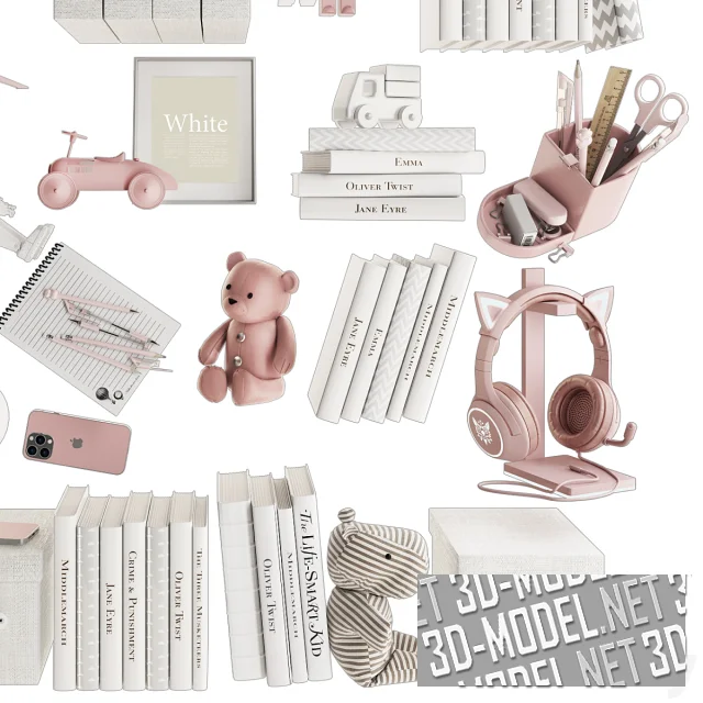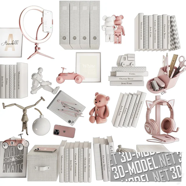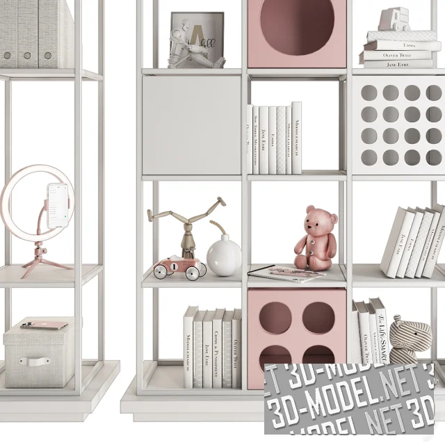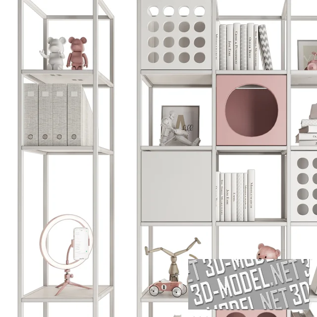 На полках стеллажей белая и розовая фигурки Bearbrick, книги, кольцевая лампа с настольным штативом, папки для бумаг и коробки, розовые наушники на подставке, фигурки человека, мягкие игрушки, модели ретро-автомобилей, органайзер с канцтоварами, фоторамки.