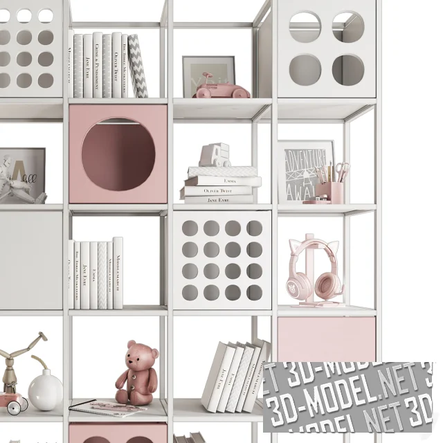 Современные стеллажи с каркасами из белой трубы квадратного сечения для детской комнаты, с игрушками и аксессуарами на полках. Представлено два стеллажа: 200х150х35см и 200х35х35см. Половина квадратных секций с открытыми полками. Остальные ячейки прикрыты створками белого и бледно-розового цветов, глухие и с круглыми отверстиями разного диаметра и количества.
