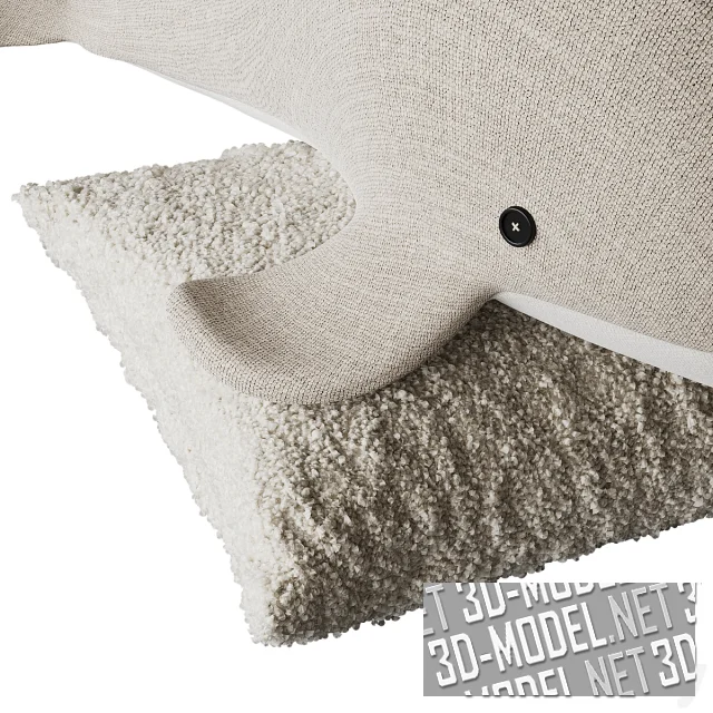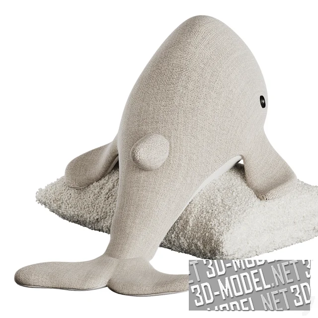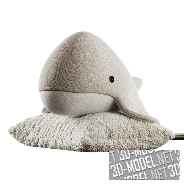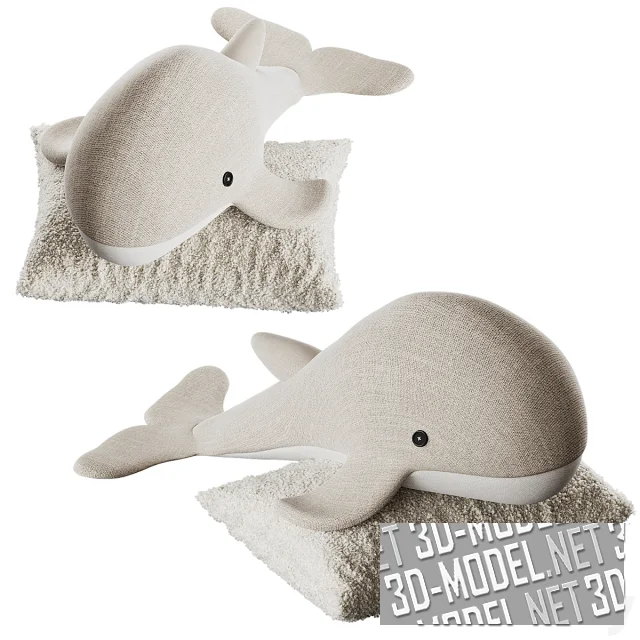 Мягкая игрушка из светлого текстиля с текстурой холста в виде милого кита на квадратной подушке из буклированной белой ткани. Глазки кита изготовлены из черных пуговиц. Габарит игрушки: 110х65х46см.