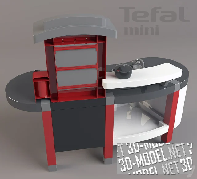 Современная игровая детская мини-кухня "Smoby" от Tefal. Блок с криволинейной скругленной столешницей темно-серого цвета оборудован игрушечными духовкой, газовой плитой, врезной мойкой со смесителем. Над столешницей смонтирована надстройка с полками, вытяжкой и кофе-машиной. Кроме серого цвета, элементы выкрашены в темно-красный и белый цвета. Мебель дополнена игрушечной посудой и аксессуарами.