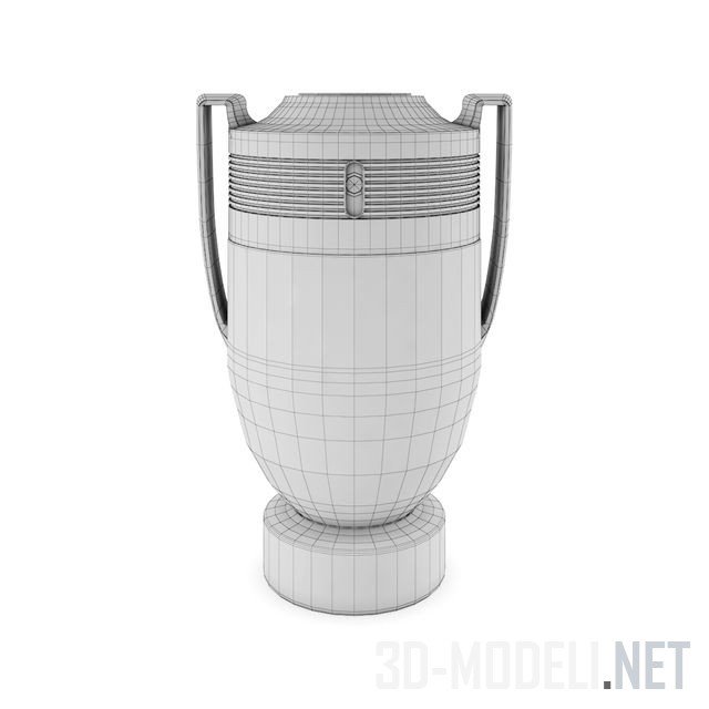 Флакон с мужским парфюмом Invictus от Paco Rabanne. Флакон выполнен в виде спортивного кубка или античной амфоры в современном исполнении, с серебристым гофрированным верхом и двумя ручками по бокам.