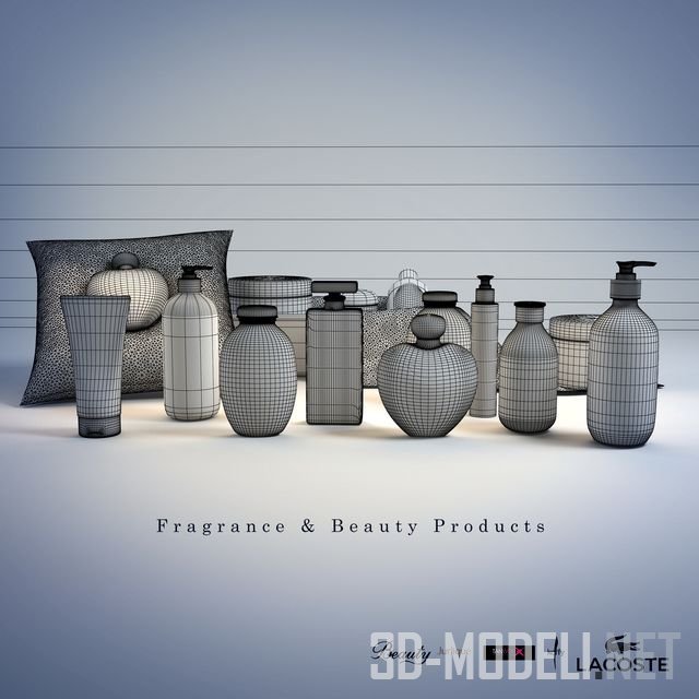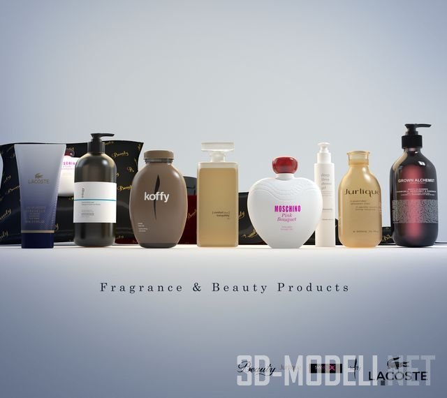 Множество различных пузырьков и баночек с кремами, тониками, духами, туалетной водой и другими парфюмерными средствами от таких известных брендов, как Jurlique, KOFY, LACOSTE и пр.
