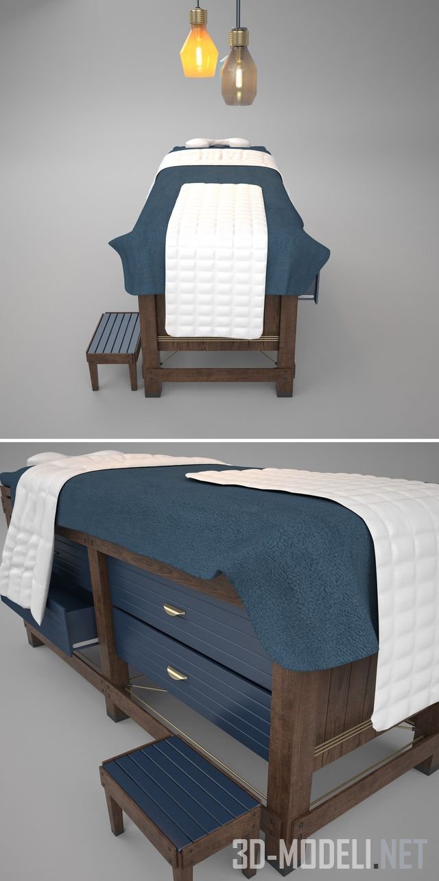 Массажный стол-лежак коричневого цвета, с выдвижными ящиками, маленьким табуретом, синим покрывалом и белыми полотенцами.