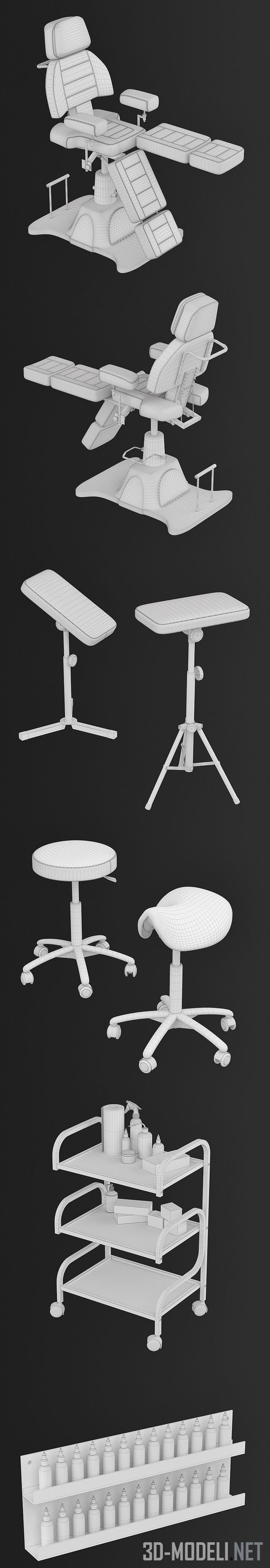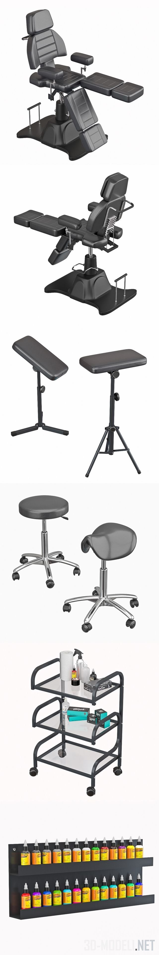 Набор современной рабочей мебели для Tattoo-салона. В набор входит большое специализированное кресло, обтянутое черной кожей, табуреты, небольшая стеклянная этажерка с инструментом и две полки на стене, заставленные красками для нанесения татуировок.