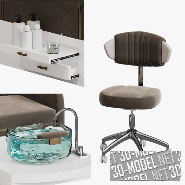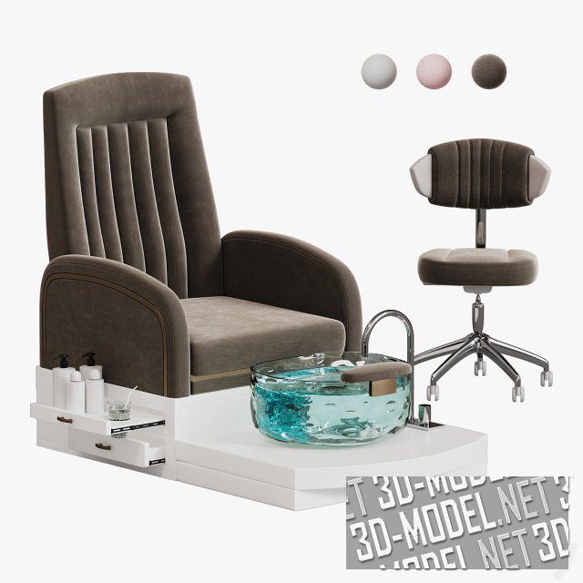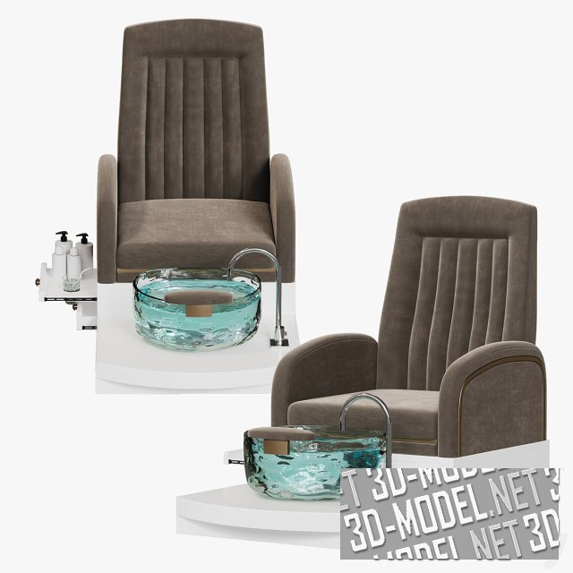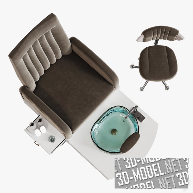 Современное кресло для педикюра Yoocell OC1087 и мобильный стул для мастера. Массивное, удобное кресло установлено на белый подиум с площадкой и выдвижными полками для аксессуаров. На площадке установлена круглая раковина из толстого прозрачного стекла с небольшой мягкой подставкой. Раковина оборудована хромированным смесителем, установленным на плоскости подиума. Представлены три варианта мягких обивок кресел и стульев: белая, розовая и коричневая.